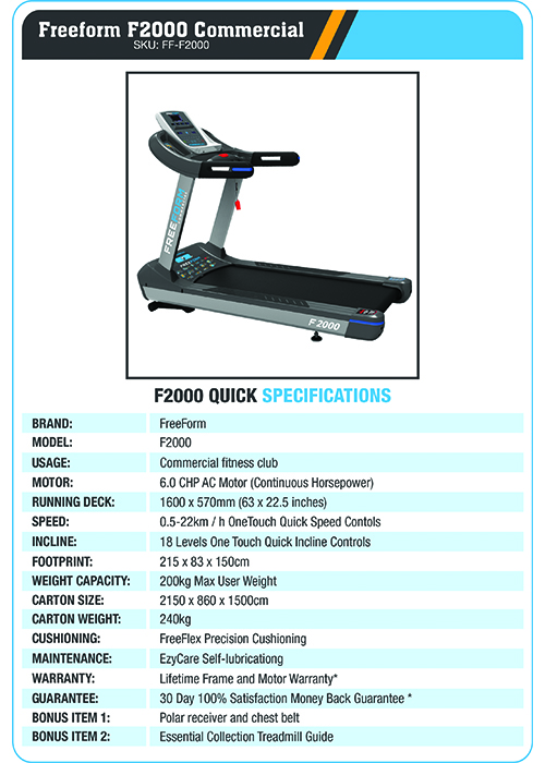 | Commercial Lifetime Warranty This FreeForm Commercial Treadmill is backed by a Commercial Lifetime Frame & Motor Warranty*. We stand by the quality of our equipment and want you to be confident with your purchase. Our warranty and servicing department is based within Australia and ready to assist your enquiry. |